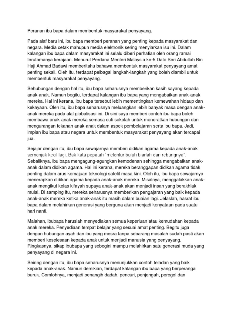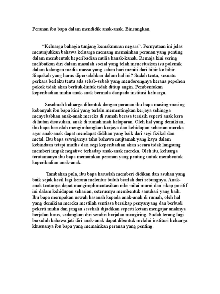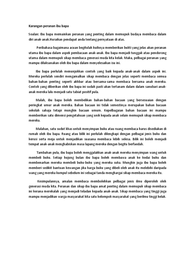Ibu bapa memainkan peranan yang penting dalam sesebuah keluarga. Hal ini demikian kerana ibu bapa merupakan orang yang paling dekat dengan anak-anak. Contoh Karangan Bahasa Melayu Spm Kertas 1 Bahagian B Peranan Ibu Bapa Menggalakkan Aktiviti Kokurikulum papar berkaitan - pada 2182018 - jumlah.